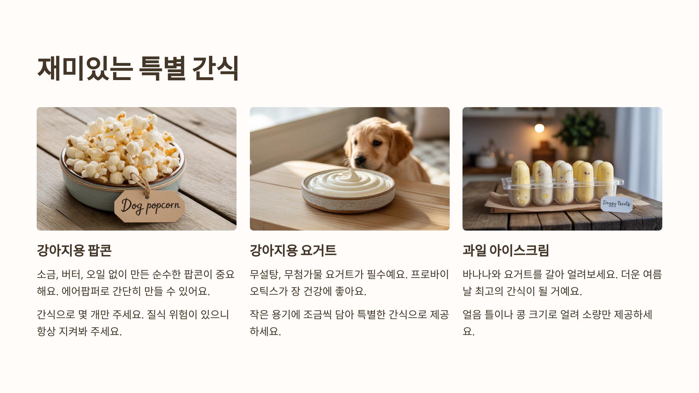 - 강아지용 팝콘: 소금, 버터, 오일 없이 에어팝퍼로 만든 팝콘은 강아지들에게 안전하고 재미있는 간식이 될 수 있습니다.강아지용 요거트 & 아이스크림: 무설탕, 무첨가 강아지용 요거트나 직접 만든 과일 아이스크림은 시원하고 맛있는 특별 간식이 됩니다.