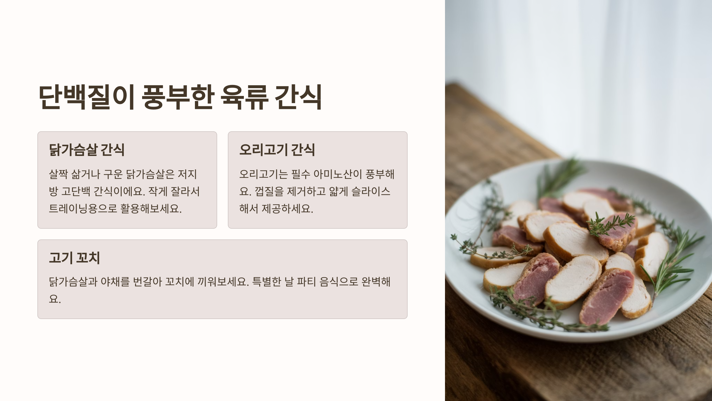 - 닭가슴살 & 오리고기 간식: 삶거나 구운 닭가슴살이나 오리고기는 강아지들이 좋아하는 훌륭한 단백질 공급원입니다. 작게 잘라서 간식으로 제공하거나, 다른 재료와 함께 꼬치 형태로 만들어도 좋습니다.