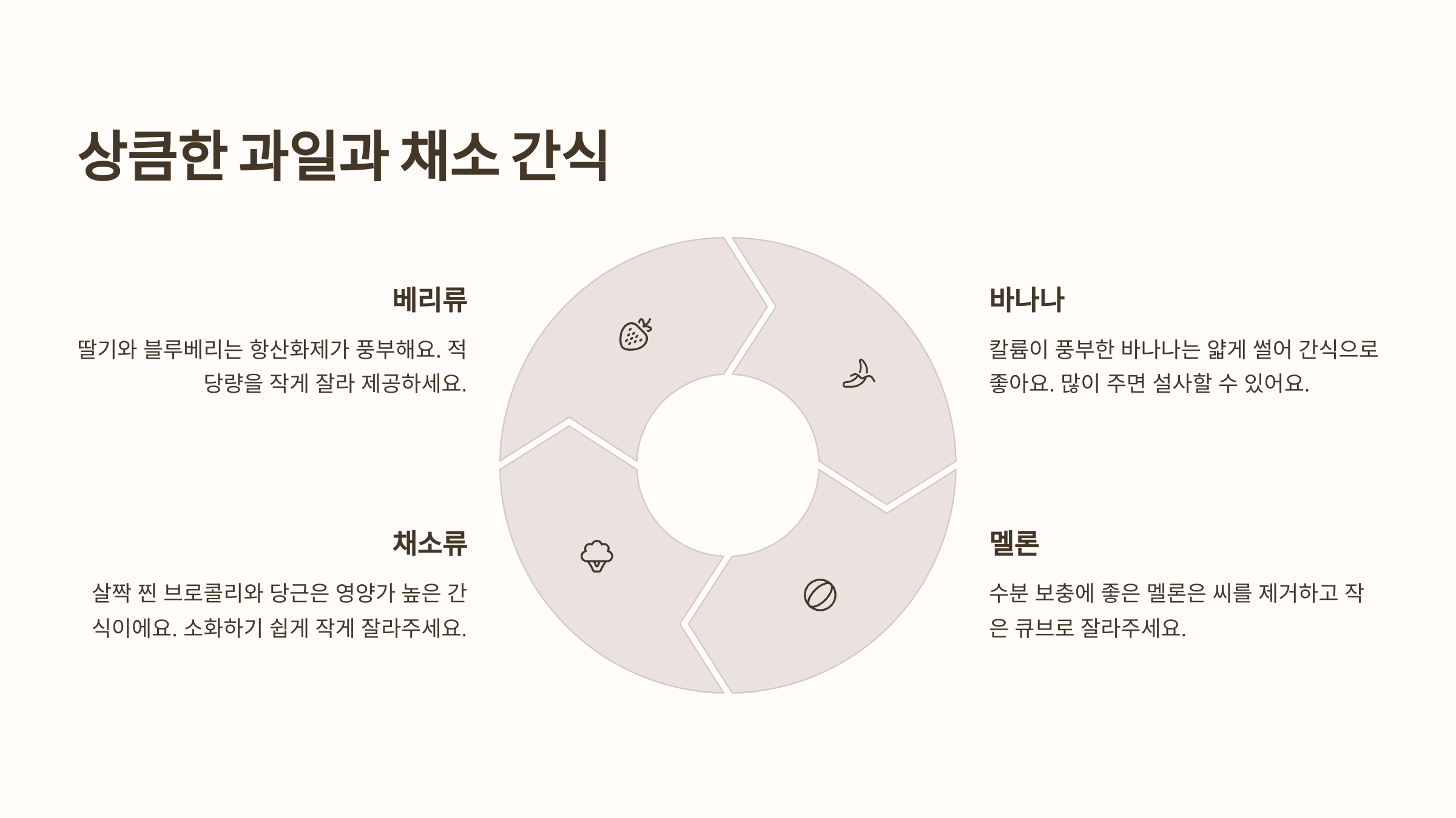 - 과일 & 채소 핑거푸드: 딸기, 블루베리, 바나나, 멜론 등 강아지가 먹을 수 있는 안전한 과일과 삶은 브로콜리, 당근 등을 작게 잘라 핑거푸드 형태로 제공하면 상큼하고 건강한 간식이 됩니다. (씨앗과 껍질 제거 필수)