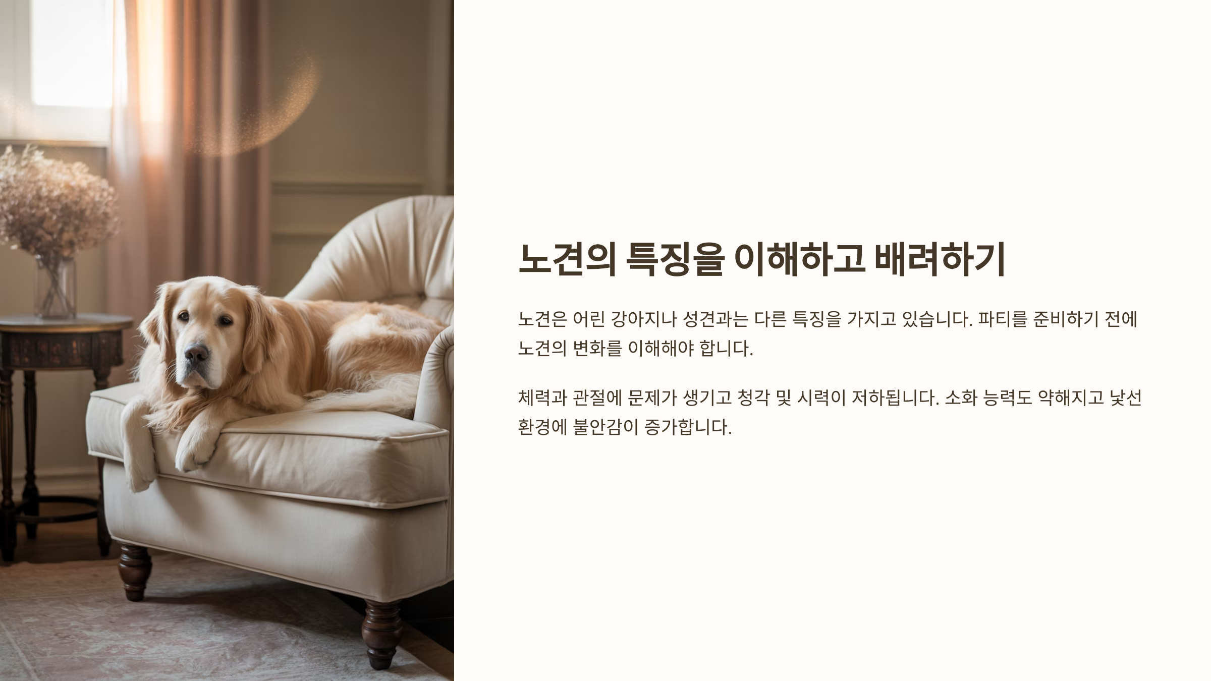 노견은 어린 강아지나 성견과는 다른 특징과 건강 상태를 가지고 있습니다. 파티를 준비하기 전에 노견의 신체적, 정신적 변화를 이해하고 배려하는 것이 중요합니다.