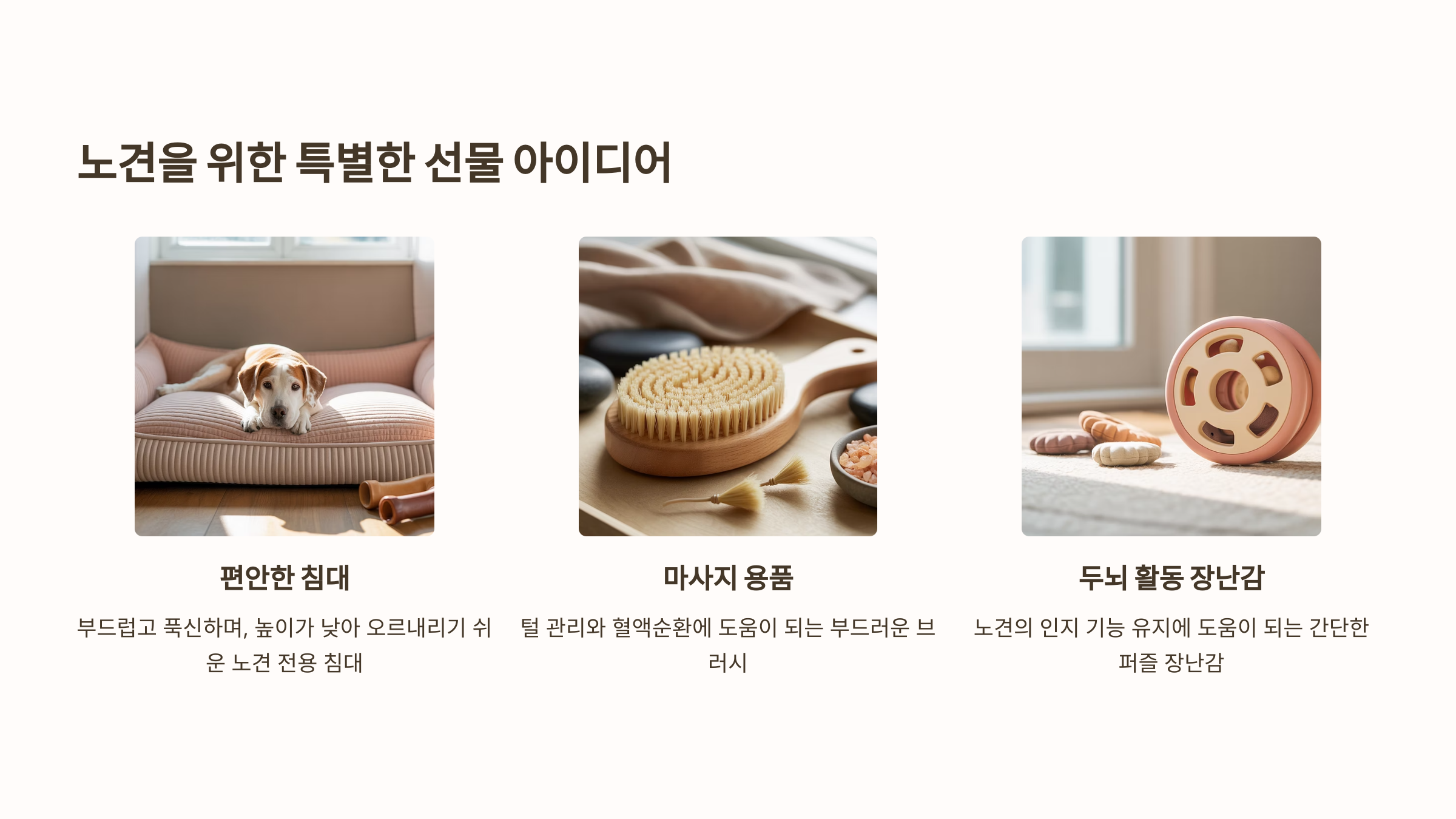 - 관절 건강 보조제: 노견의 관절 건강 관리에 도움이 되는 영양제를 선물합니다. 수의사와 상담 후 적절한 제품을 선택하는 것이 좋습니다.