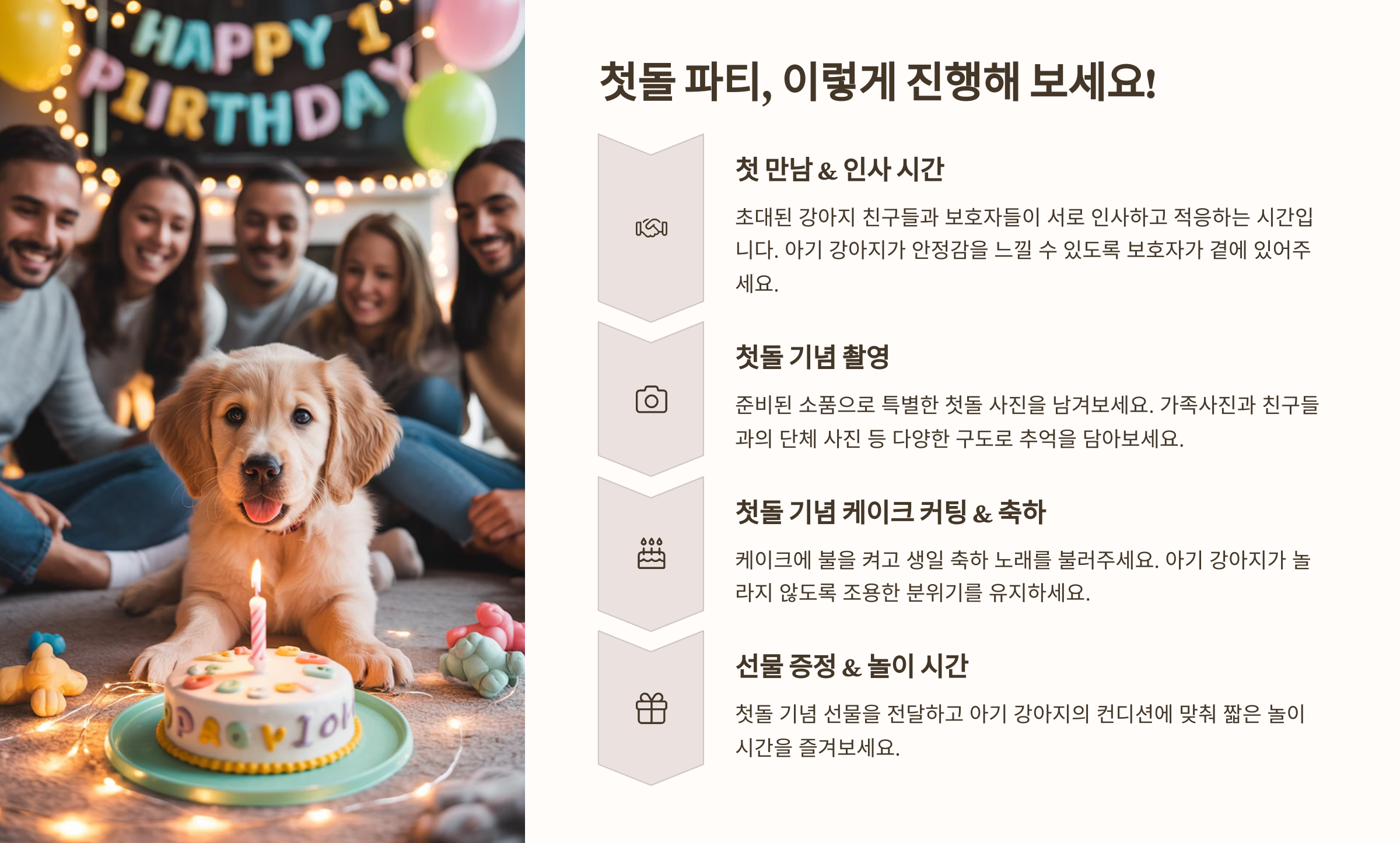 - 초대 손님 선정: 가족 구성원은 물론, 평소 우리 강아지와 친하게 지내는 강아지 친구들과 보호자들을 초대하는 것도 좋은 생각입니다. 너무 많은 인원은 아기 강아지에게 스트레스를 줄 수 있으니 적절한 규모로 초대하는 것이 중요합니다.