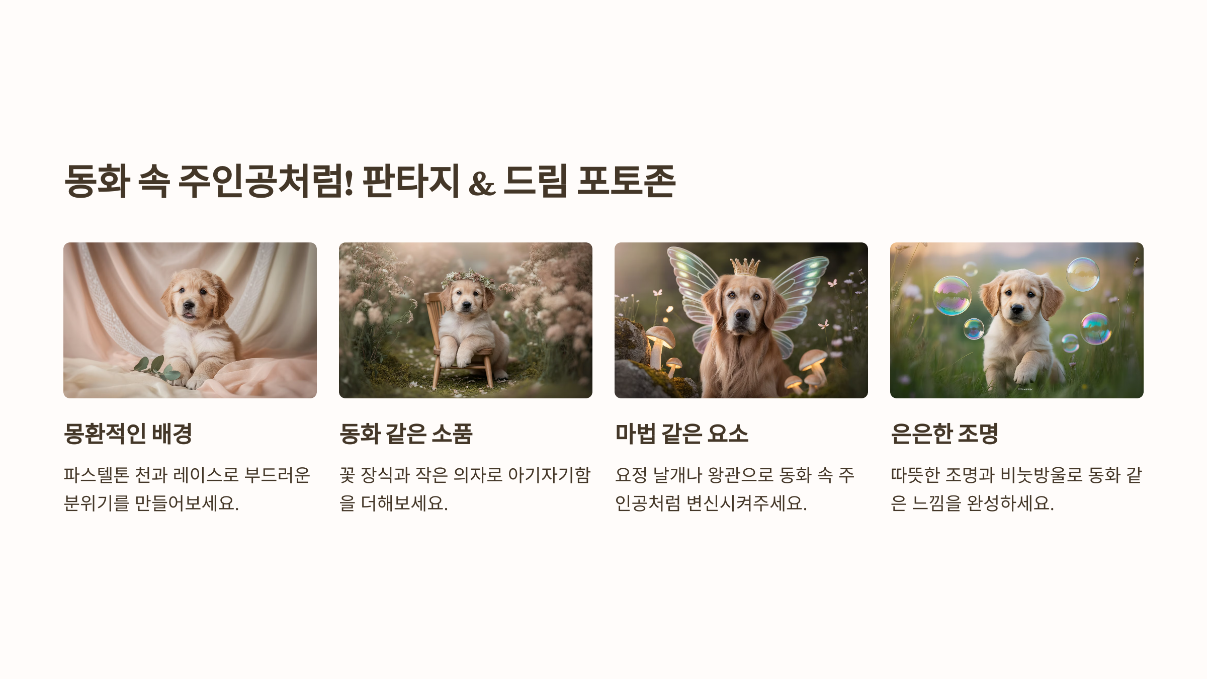 - 연출: 부드럽고 몽환적인 분위기를 연출하여 우리 강아지를 동화 속 주인공처럼 만들어 줍니다.