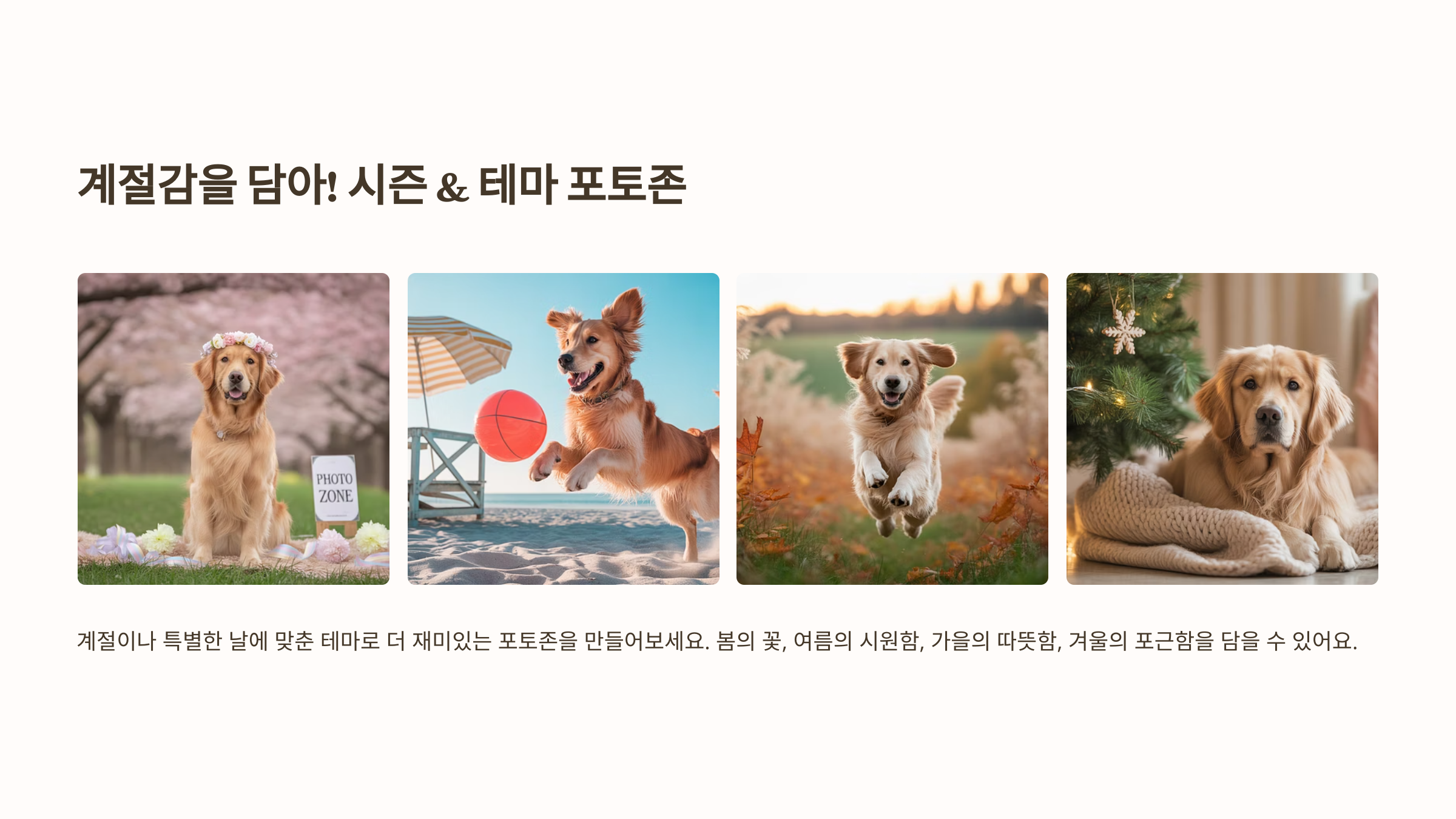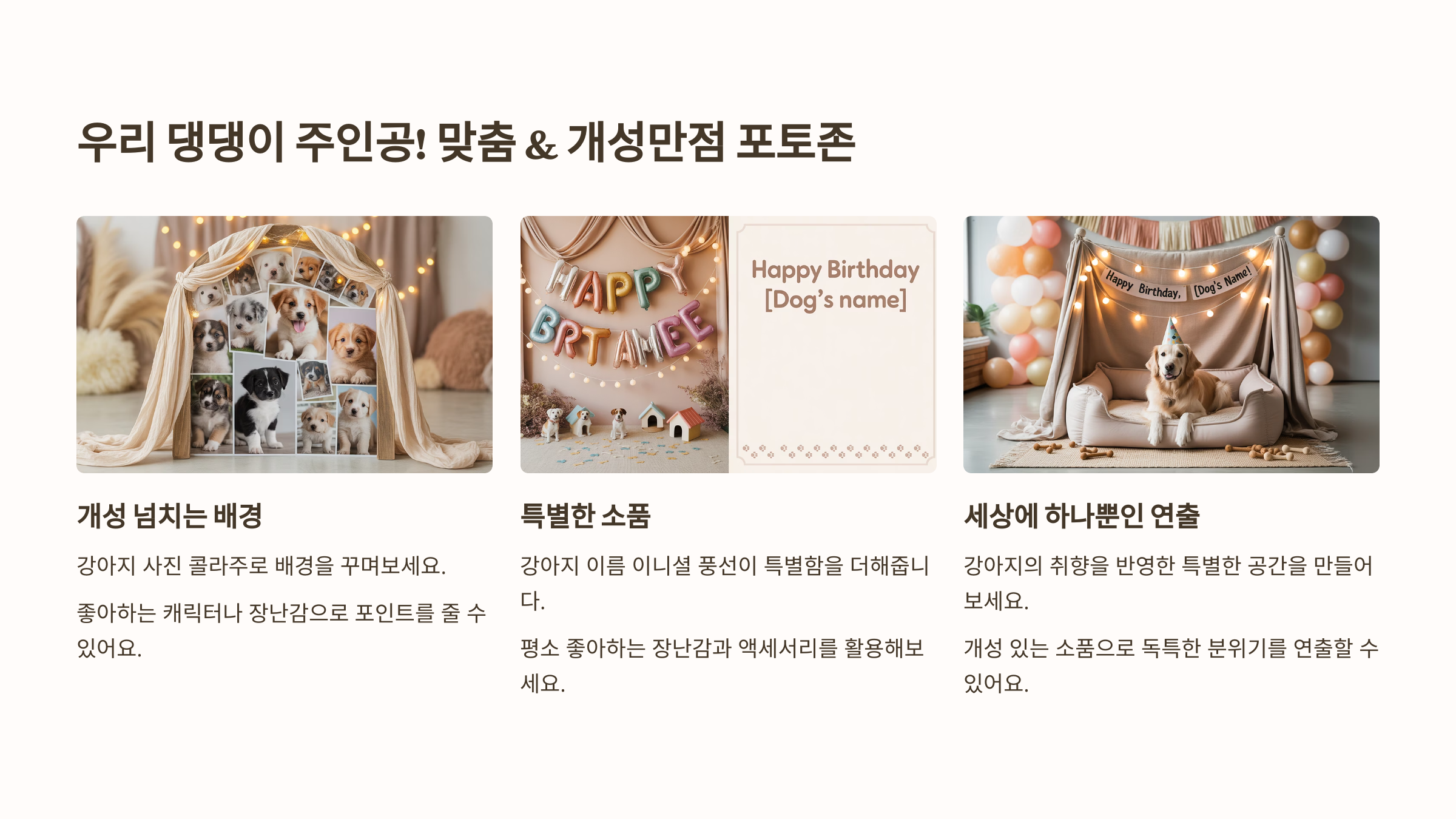 - 연출: 우리 강아지의 개성과 취향을 반영하여 세상에 하나뿐인 특별한 포토존을 만듭니다.
