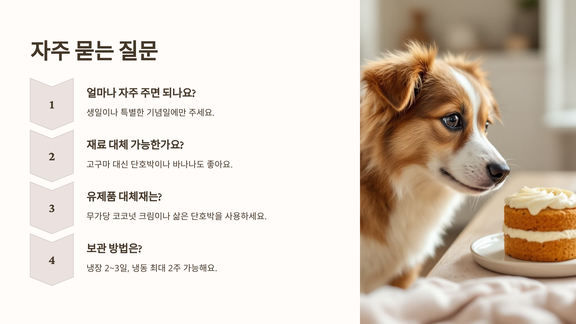 직접 만든 케이크에 어떤 재료를 넣어보셨나요? 혹시 강아지가 좋아했던 의외의 재료가 있다면 댓글로 꼭 공유해 주세요. 함께 아이들의 건강하고 행복한 생일을 만들어가봐요.