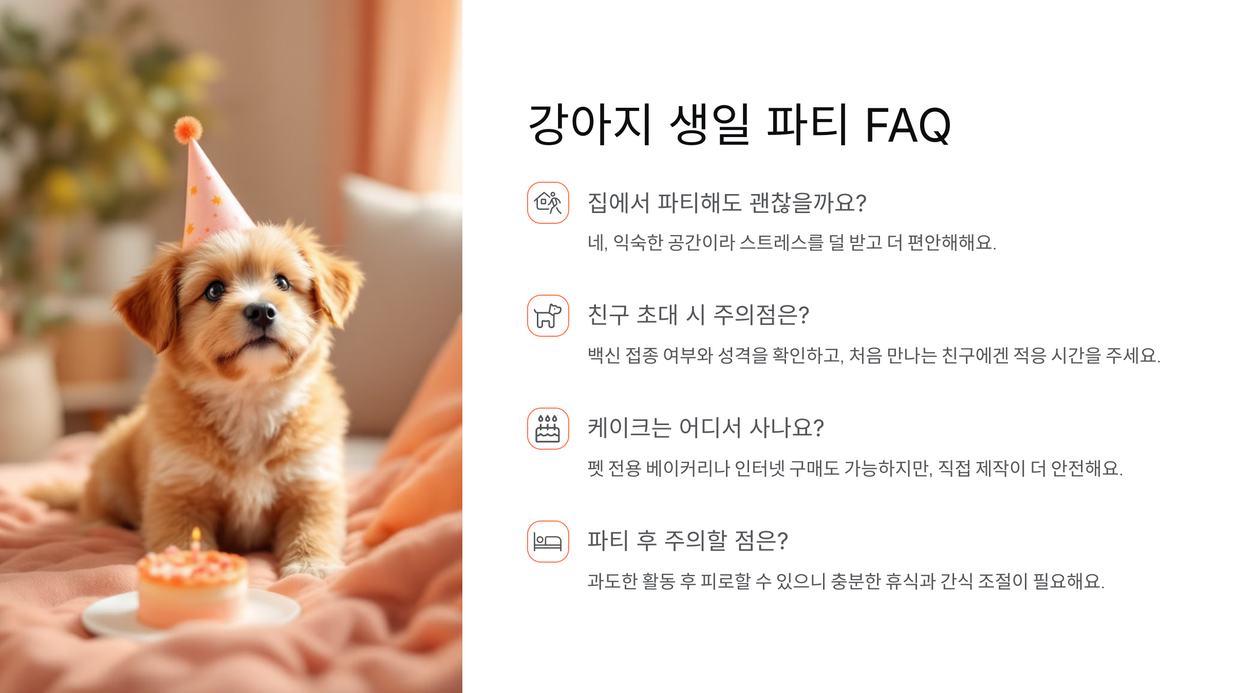 요즘은 반려견 전문 파티 서비스를 제공하는 업체도 많아요. 테마 데코부터 간식, 촬영까지 모두 포함된 패키지도 있어요. 직접 준비할 시간이 부족한 분들이나, 한 번쯤은 제대로 챙겨주고 싶은 분들에게 추천드려요. 일부 업체는 수의사 상담도 함께 진행해 반려견의 건강 상태까지 고려한 맞춤 서비스를 제공하니, 보다 안전하게 생일을 기념할 수 있어요.